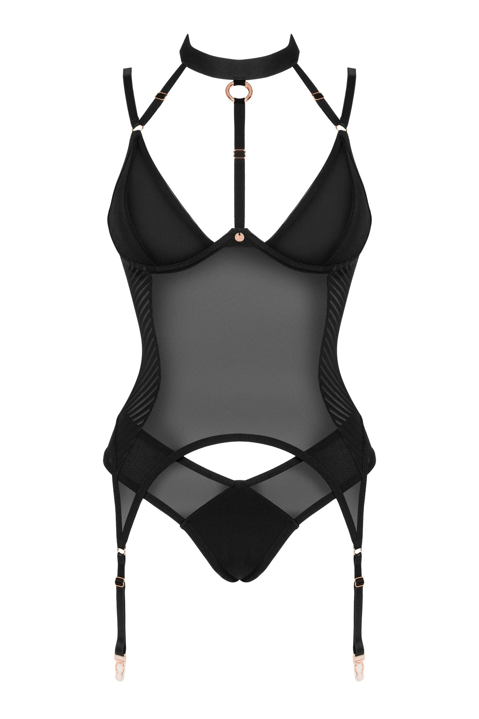 The black corset is a minimalist cut combined with beautiful details in a shade of rose gold. This is an exceptionally elegant design, made of delicate mesh, for many hot occasions.